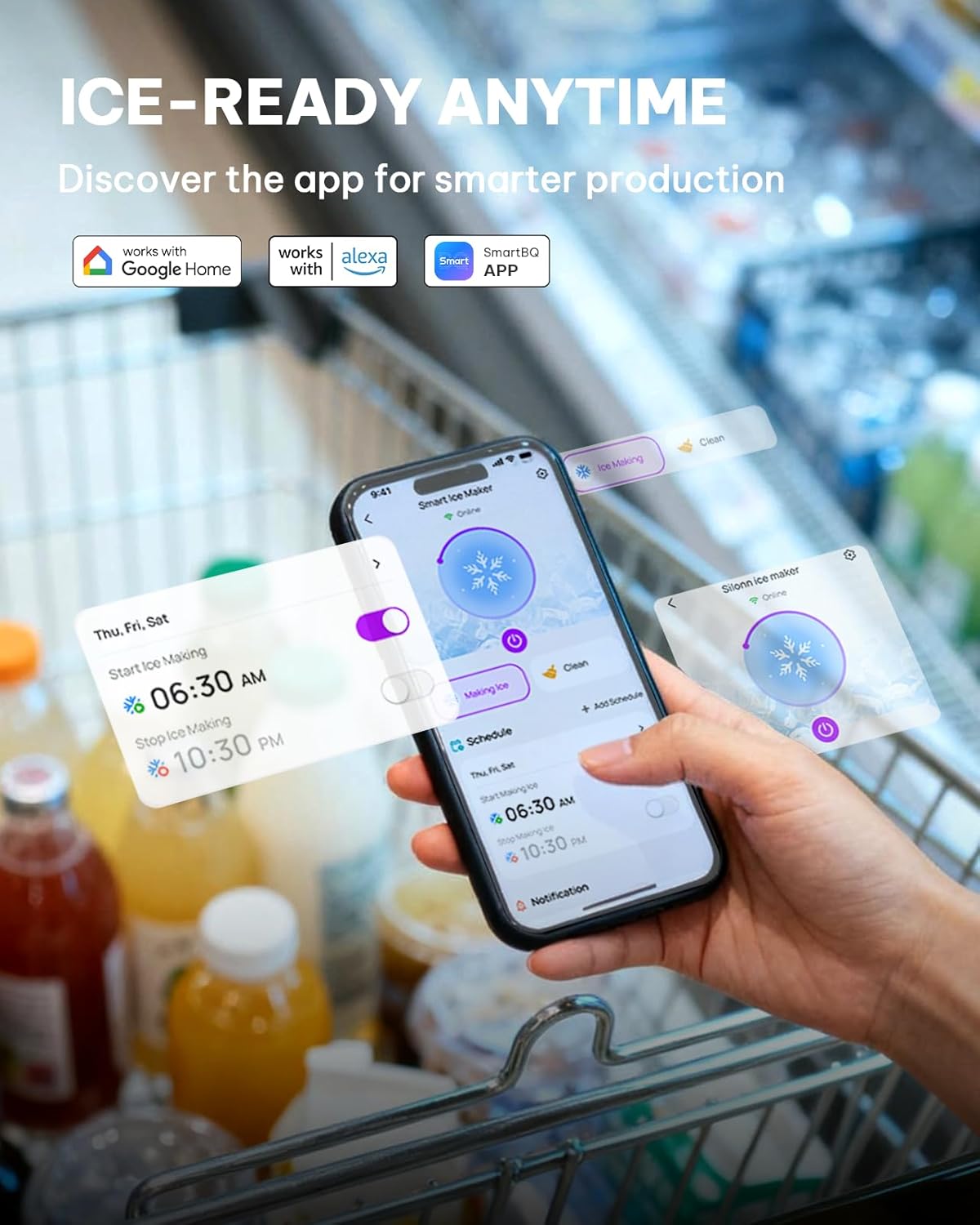 Smart App & Voice Control: The pebble ice maker has an intuitive LED color display. Simply press the "ice" button to start making ice. You can also control ice making with just your voice – freeing up your hands for other tasks. With the SmartBQ App, you can easily use it remotely with a timer function that lets you enjoy fresh ice anytime.